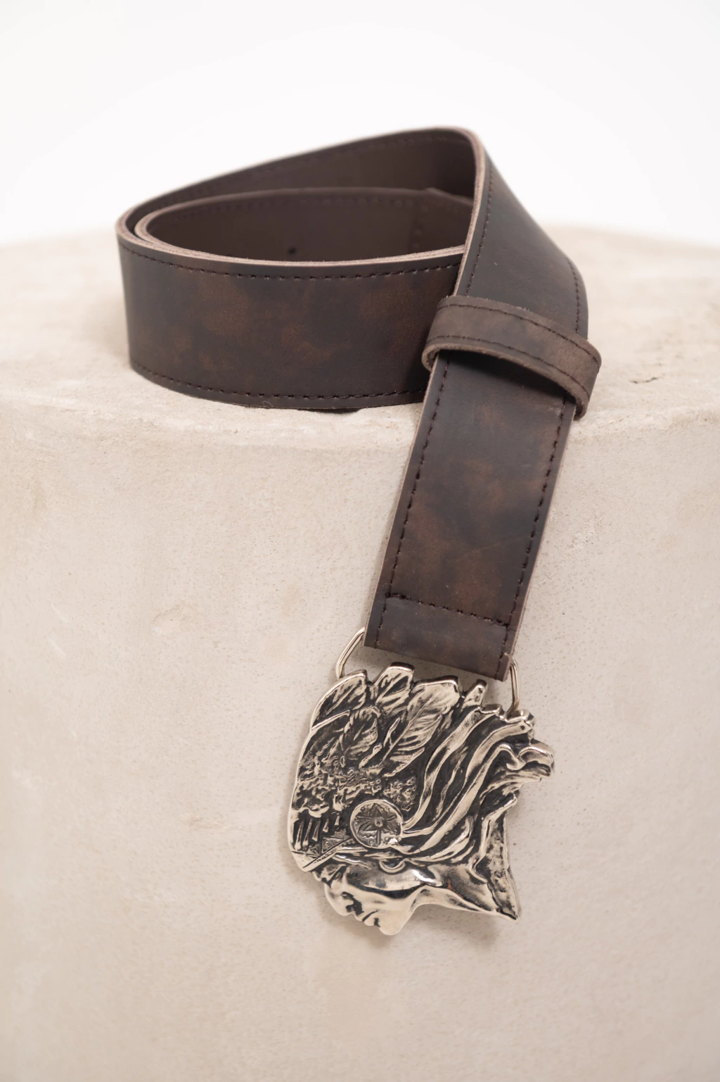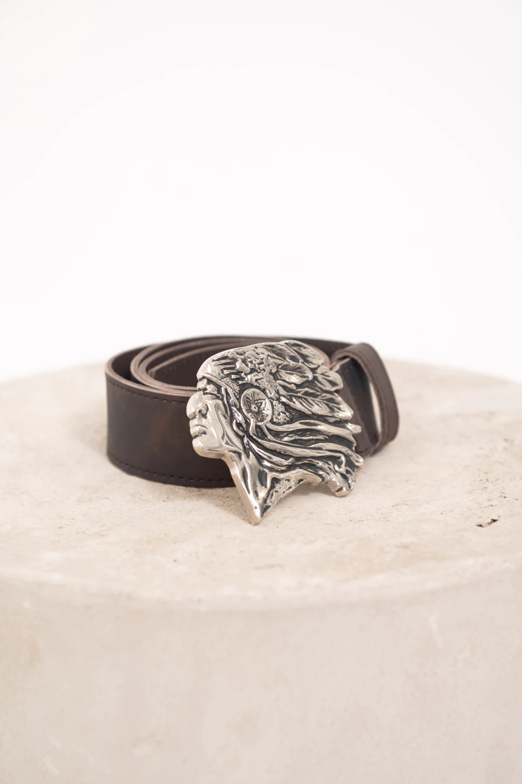 Cinturón realizado 100% en cuero con efecto desgastado. La parte interna está realizada en cuero liso. La hebilla es metálica y tiene el diseño de un cacique.